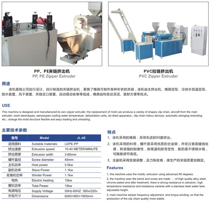 RC-拉鏈擠出機(jī) 拉鏈擠出機(jī)用途:該機(jī)是我公司自行設(shè)計(jì)、自行制造的夾鏈擠出機(jī),更換了模具可制作各種形狀的夾鏈,該機(jī)由主擠出機(jī),模具定型,冷卻水恒溫定型,脫水裝置,風(fēng)干裝置,夾鏈合口裝置,自動(dòng)擺動(dòng)收卷等組成,模具結(jié)構(gòu)變動(dòng)靈活,裝卸方便等優(yōu)點(diǎn)。